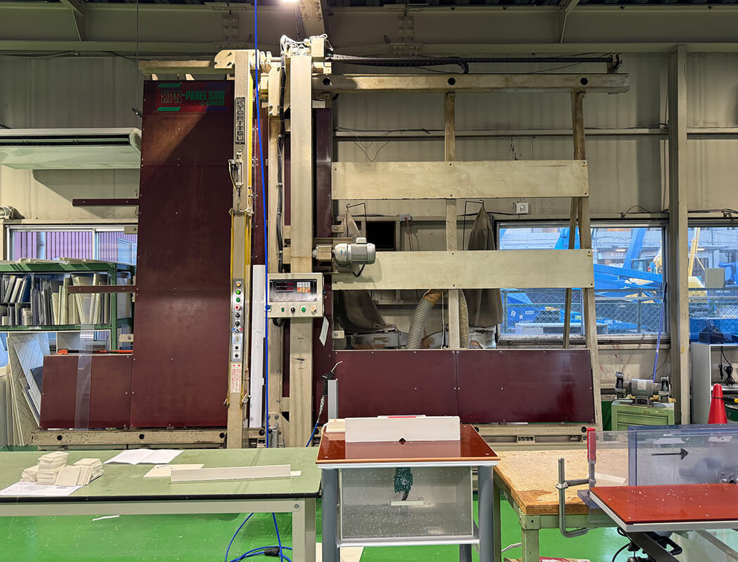 大型の切断機です。これは、合板や木材などの大きな板材を直線的に切断するために使用されます。縦型の機械で、切断したい板を立てかけてノコ刃を走らせて切断します。